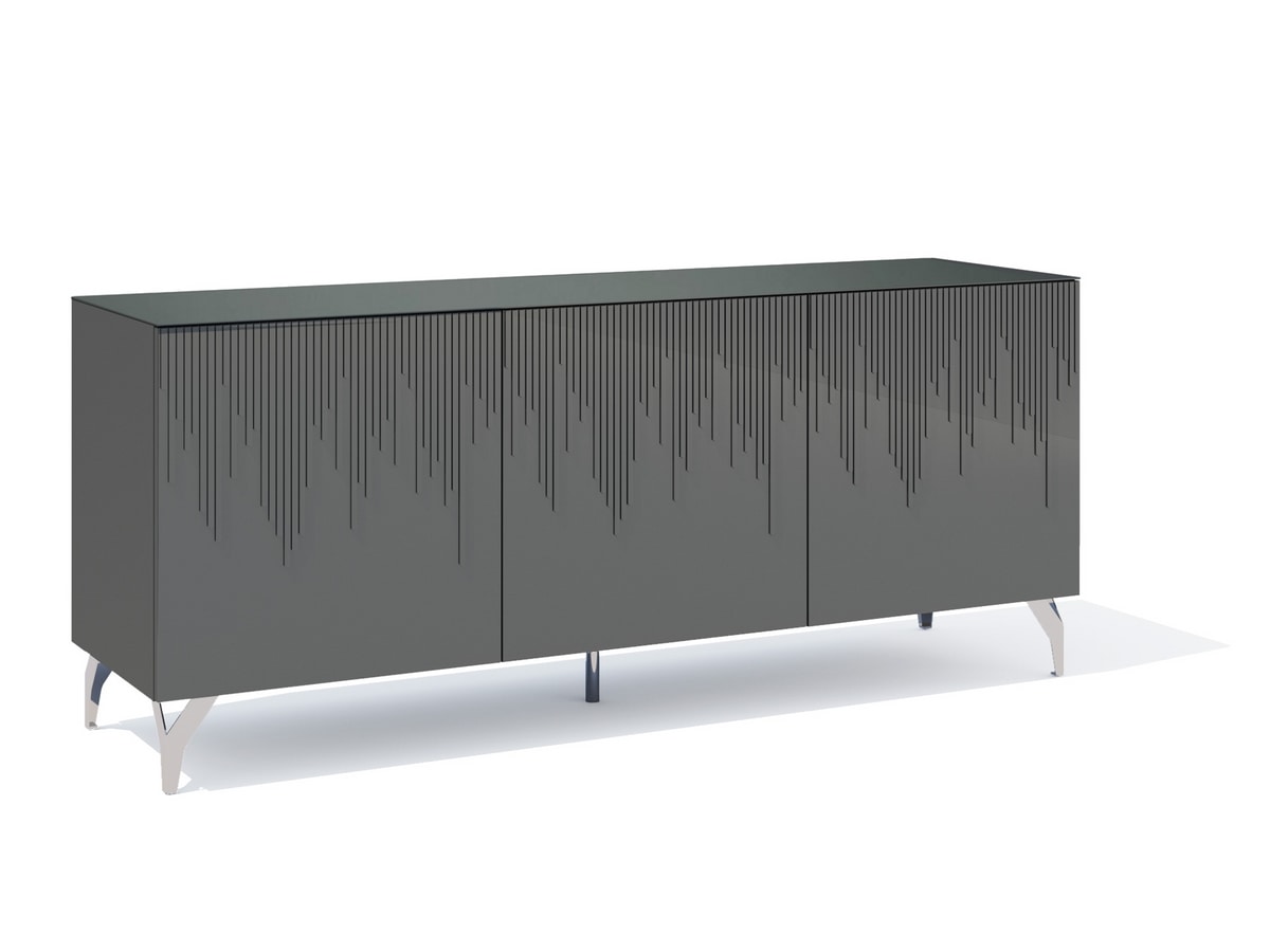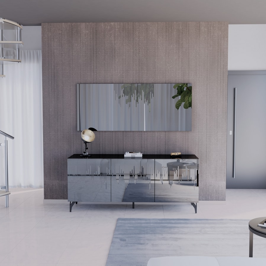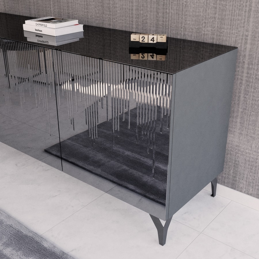 Madia 3 ante con specchiera. Fianchi laccati antracite, Ante con specchio inciso fumé. Piede Ypsilon in metallo verniciato antracite, Top in specchio fumé. Specchiera abbinata con incisioni.
