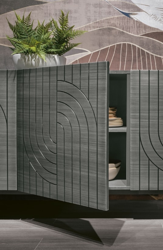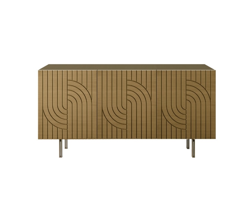 Madia di design con ante pantografate e finitura spazzolata