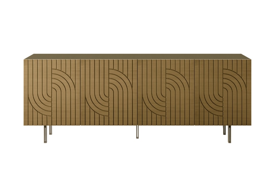 Madia a quattro ante con corpo e ante in laminato e frontali in laccato effetto spazzolato. Disponibile con piedini di diverse dimensioni. Lunghezza: 220 cm.