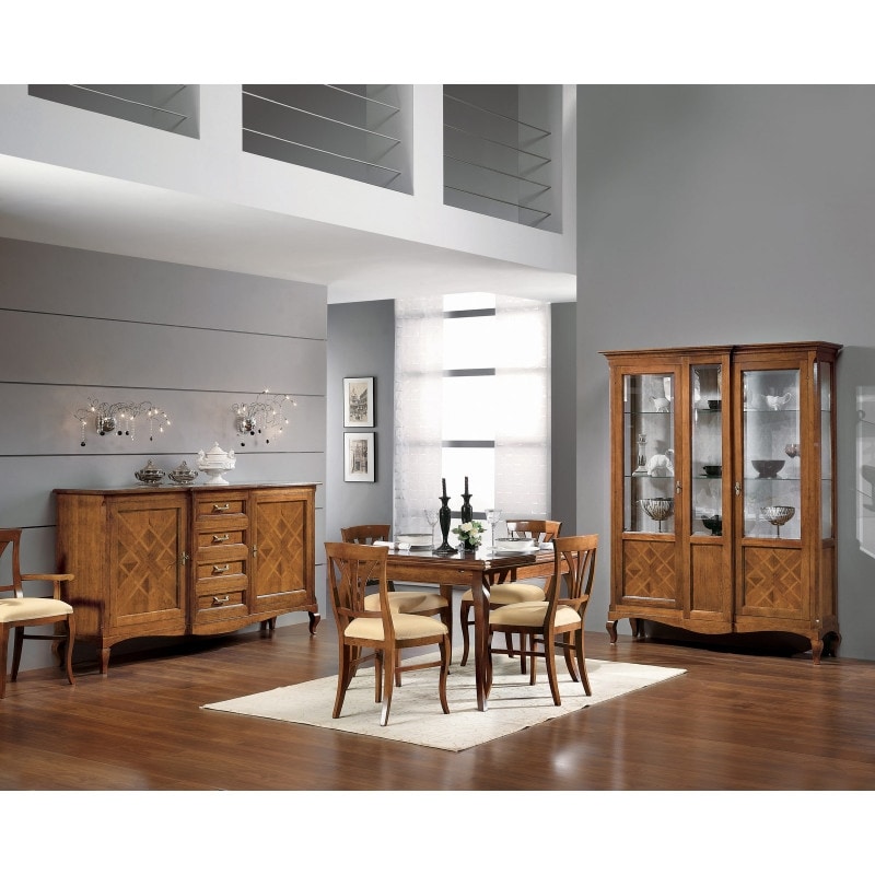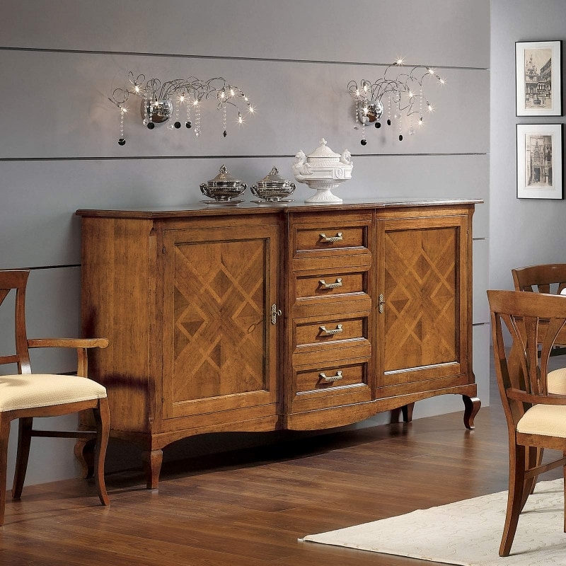 Richiedi prezzi Prodotti similiCredenza a due porte e quattro cassetti. Grazie alle proporzioni moderne e allo stile classico di cui è dotato, questo mobile si presta ad essere inserito sia in arredamenti dal gusto classico ma anche in arredamenti di tipo moderno.