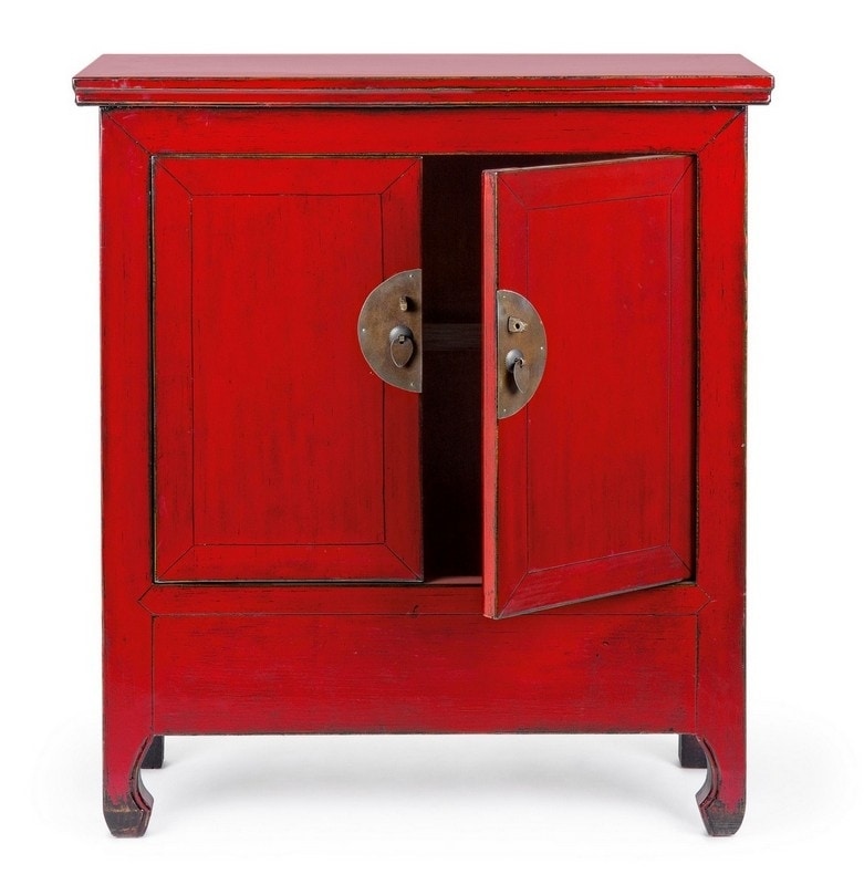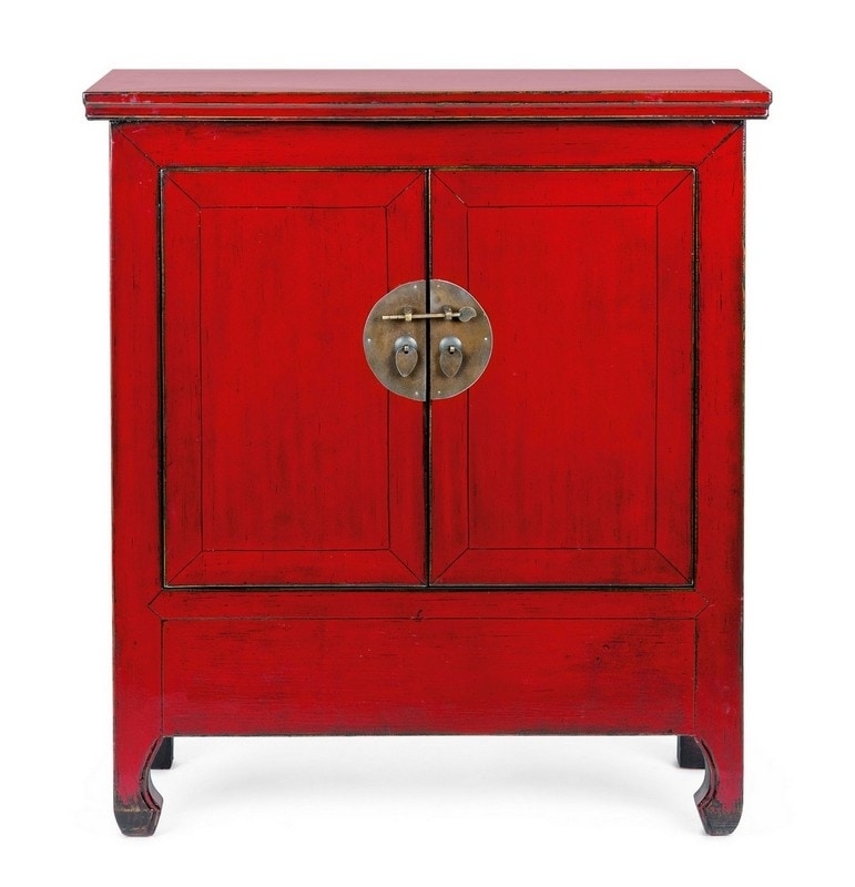 Credenza con struttura in legno di olmo. Schienale e pannelli interni in compensato. Finitura lucida e patinata a base d'acqua. Maniglie in rame.