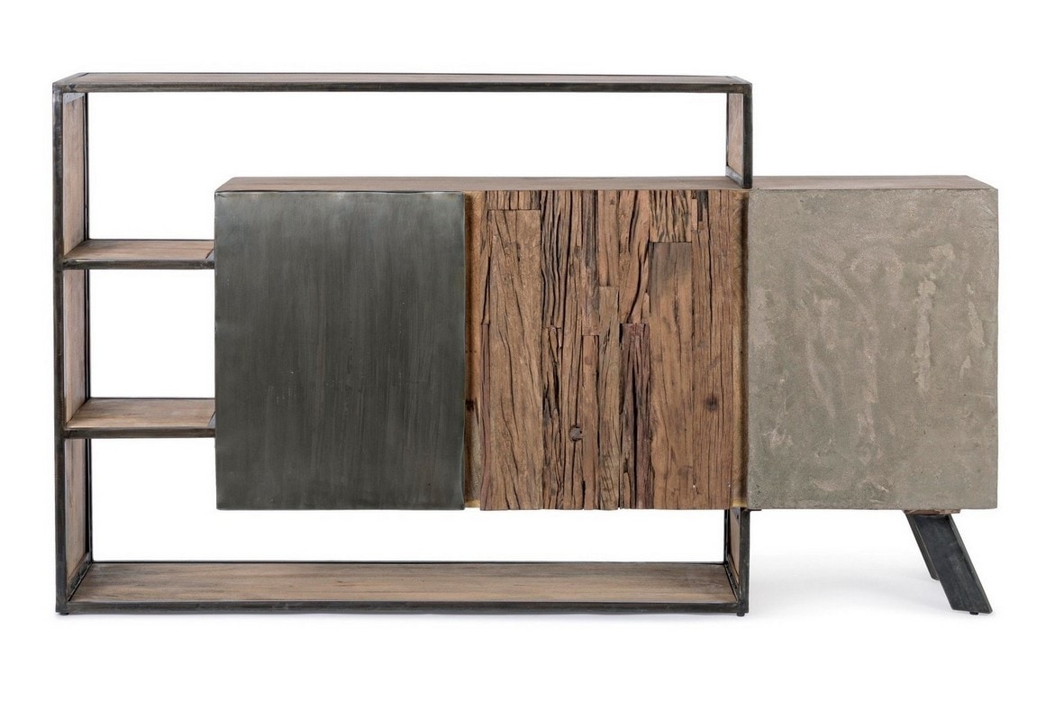 Credenza con struttura in legno mango ed acciaio, schienale in compensato. Frontale ante e cassetti in legno riciclato o lamina di acciaio o finitura in fibra di cemento. Finitura acrilica protettiva.
