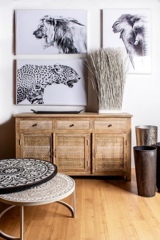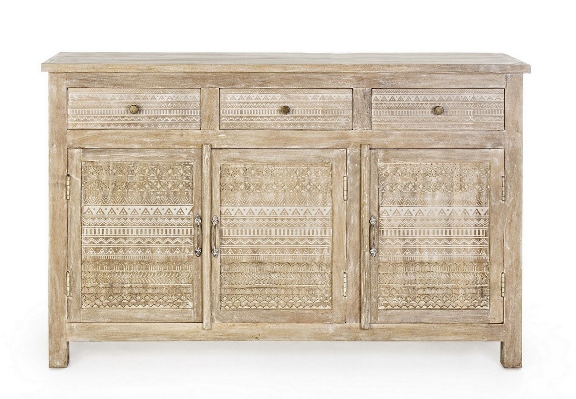 Credenza con struttura in legno di mango con decorazioni intarsiate a mano, schienale e fondo cassetti in mdf. Finitura a base di nitrocellulosa. Vano porta comprensivo di mensola. Maniglie e pomelli in ottone.