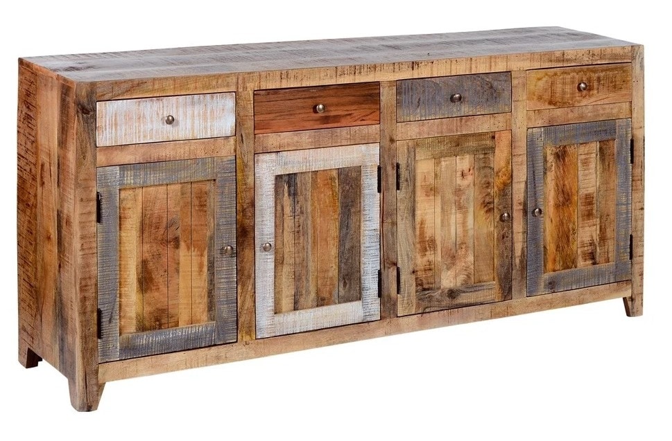 Credenza Brest dotata di cassetti e ante. Il mobile è una credenza particolare che prende corpo da legno massello riciclato. Quello in oggetto è un complemento d'arredo molto affascinate, che emerge per la sua varietà di colori, abbinabile in molti locali zona mare, pianura e montagna.