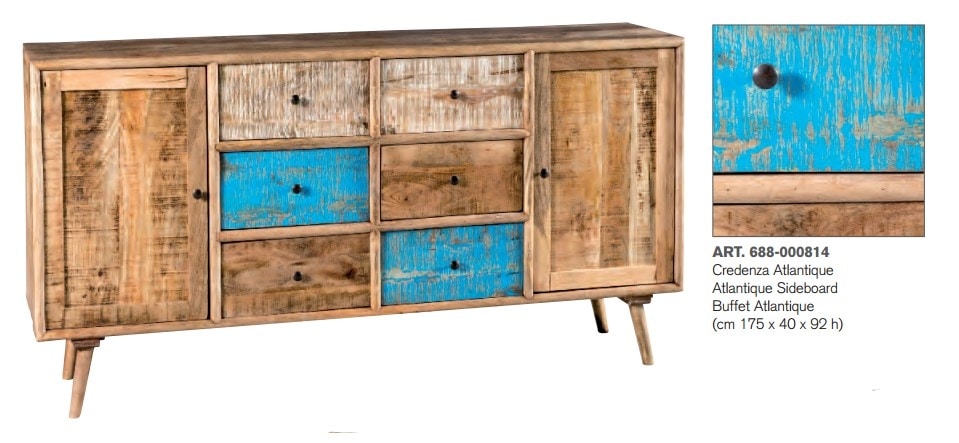 Credenza realizzata in legno massello di mango con schiena e fondo cassetti in compensato e legno.