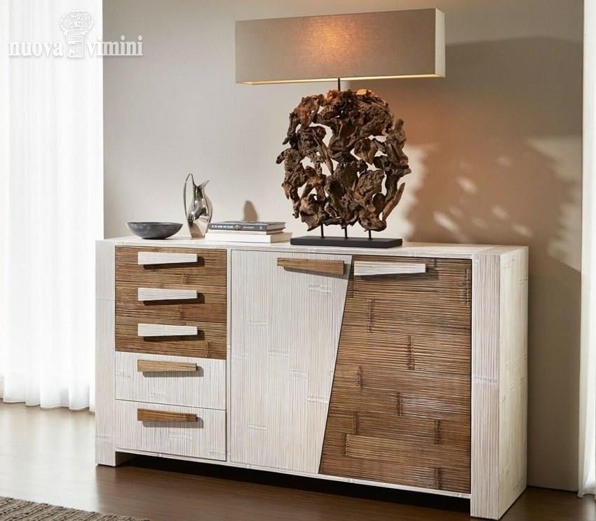 Credenza etnica in crash bambù, finitura white miele. Dotata di 2 ante e 5 cassetti.