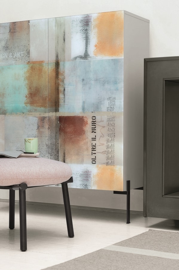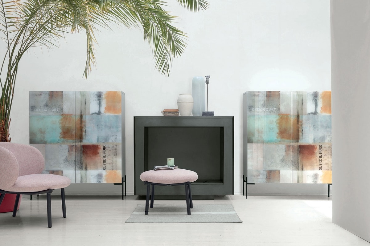 Madia per salone disponibile a due o tre ante e con diverse altezze. Struttura in laminato o laccato eccimeri, piedini in vetro trasparente o metallo nero, frontali in grès o vetro con stampa digitale.