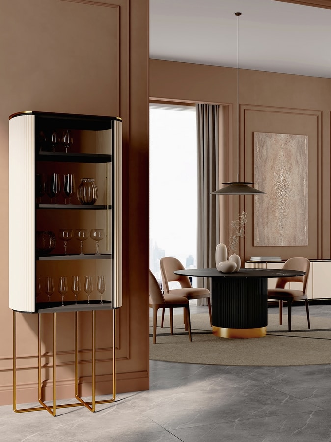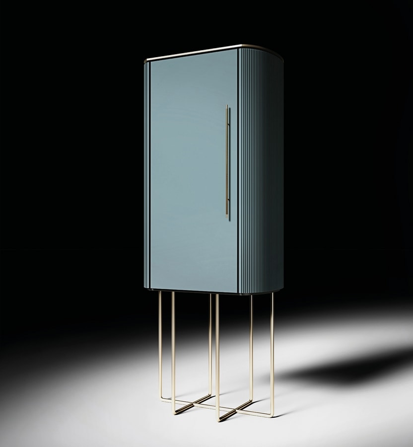 Realizzata in legno laccato e finitura in ottone lucido, è disponibile in due diverse configurazioni: espositivo (con anta in vetro) o nascosto (con anta laccata) per mettere in mostra i propri oggetti o nasconderli da occhi indiscreti.