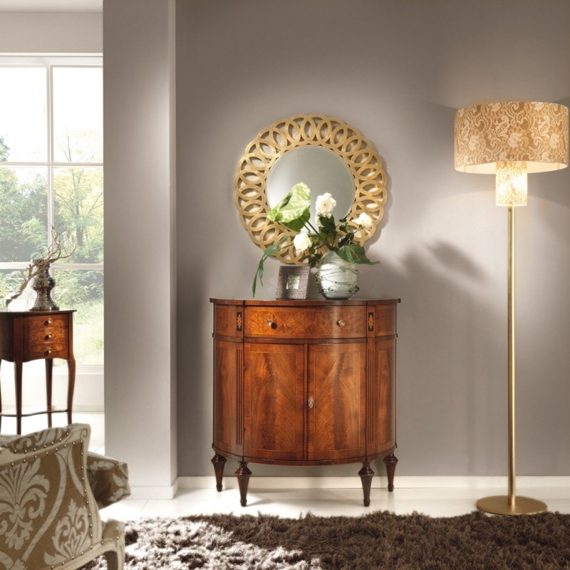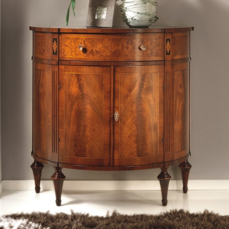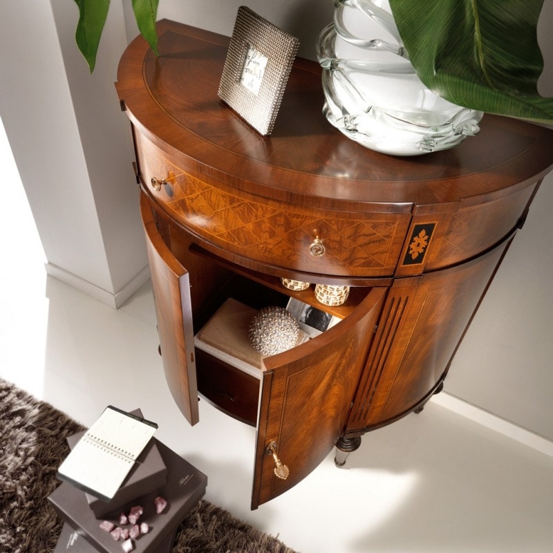 Richiedi prezzi Prodotti similiCredenzina a mezzaluna dotata di due antine e un cassetto. Spalle rigate verticalmente nella parte inferiore, decorate da un fine intarsio nella parte superiore. Mobile arricchito dalla piuma di noce racchiusa da belle filettature, frontale dei cassetti in radica, gambe elegantemente tornite. Opere uniche realizzate con tecniche antiche che trasmettono la maestria dal passato ai nostri giorni.