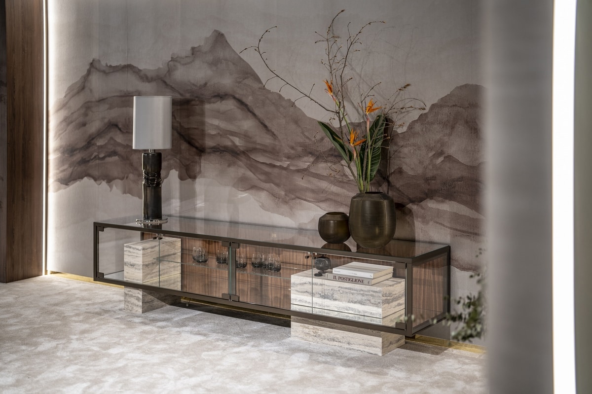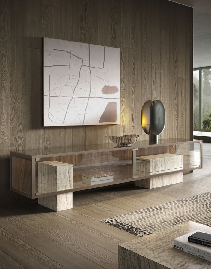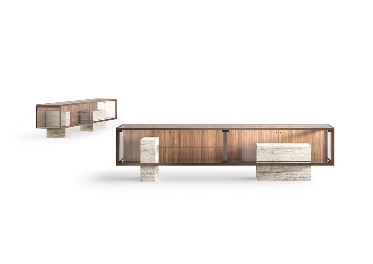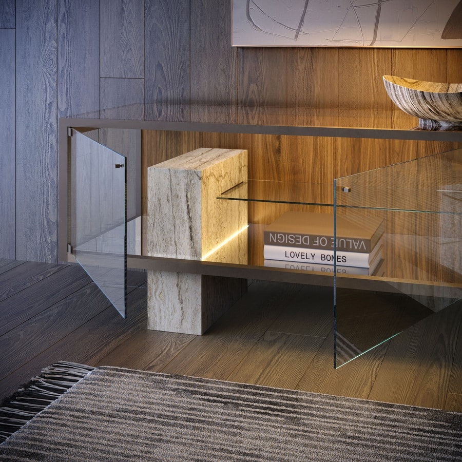 Richiedi prezzi Prodotti similiLa credenza Dune combina noce canaletto e vetro in un raffinato gioco di riflessi. Solide basi in pietra naturale forniscono stabilità e peso visivo, bilanciando volumi pieni e vuoti. Un fondo a specchio e l'illuminazione LED integrata esaltano ogni dettaglio con luminosità e profondità.