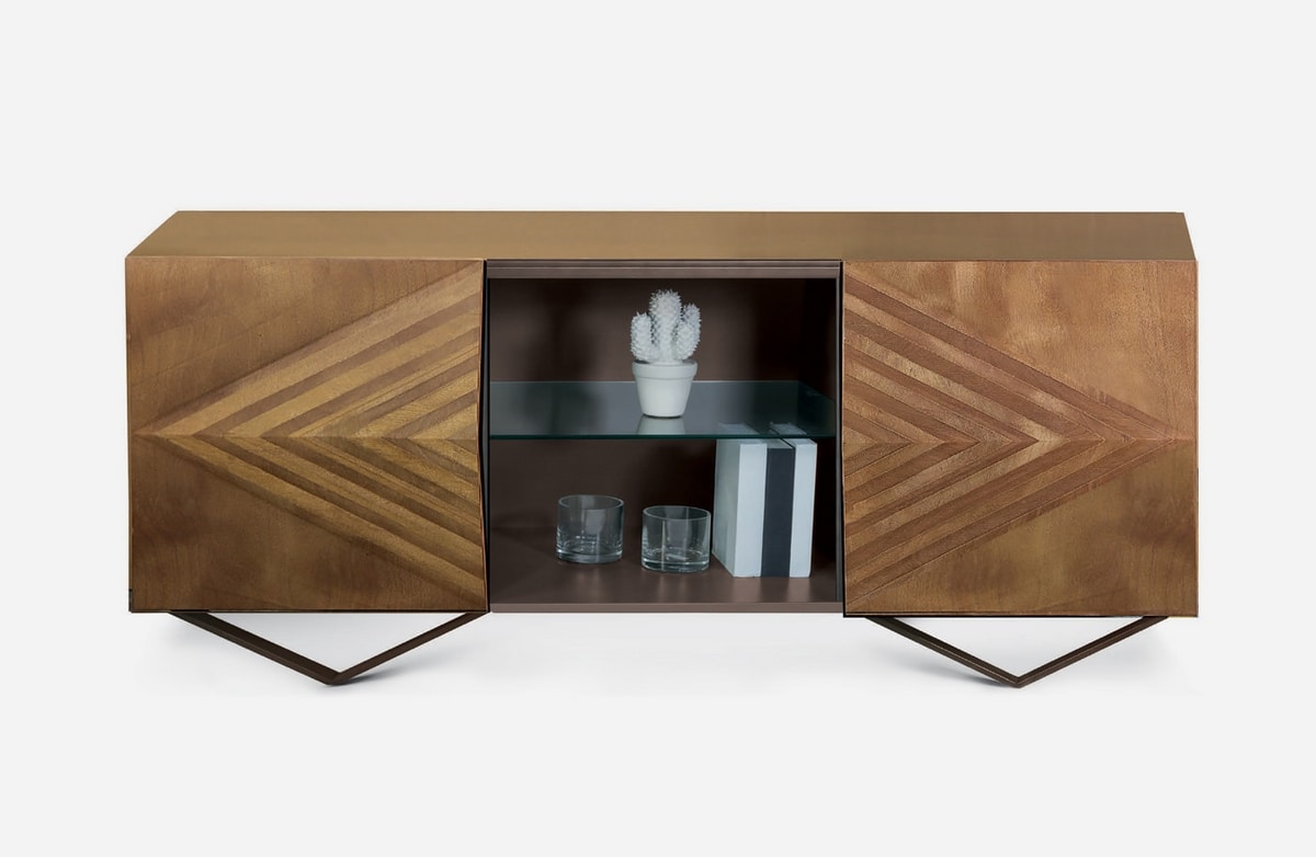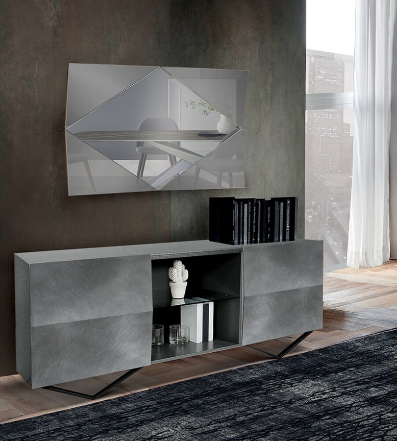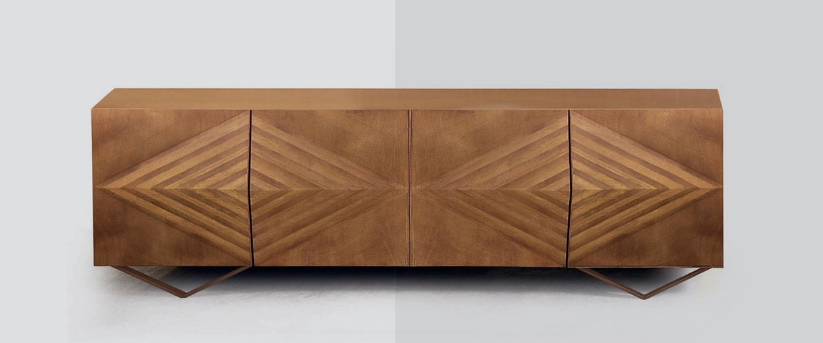 Madia, struttura in legno laccato, 4 ante sfaccettate con rilievo, laccate o in legno lavorato a vista, basi in metallo.