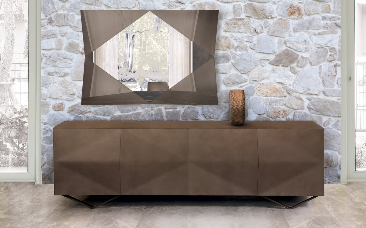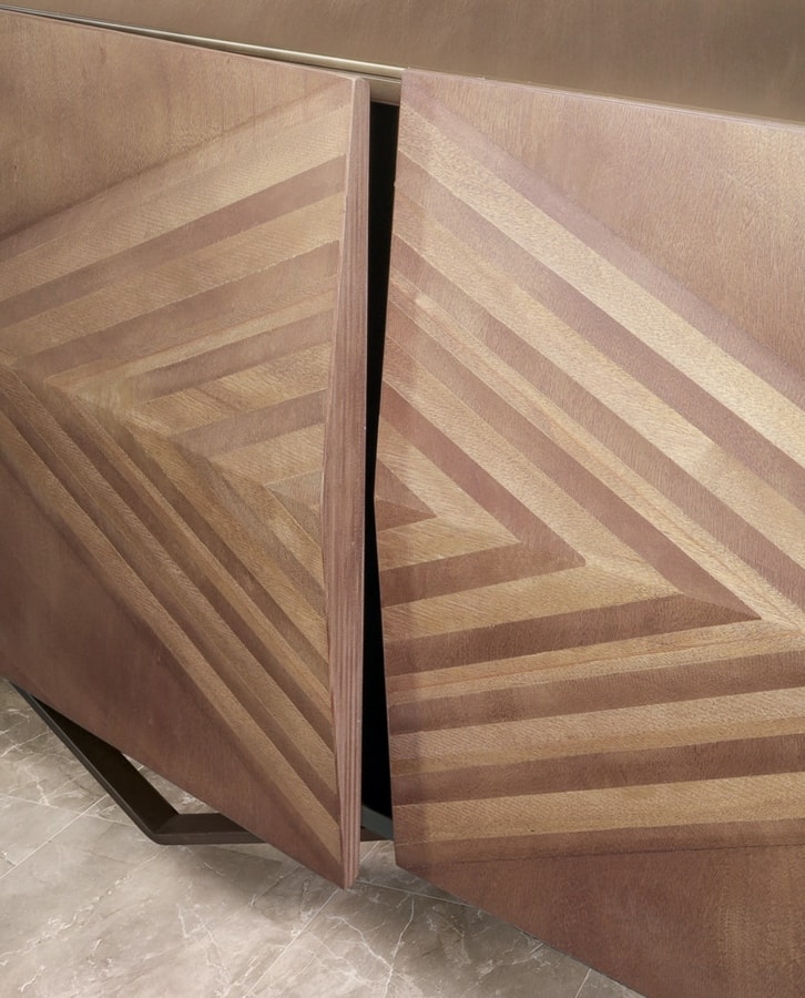 Un gioco di sfaccettature per un design di alta classe realizzato con maestria artigianale. Come una pietra preziosa, la Madia “ESMERALDA” risplende in ogni ambiente con l’eleganza delle sue finiture, la raffi nata geometria delle forme e la ricercatezza dei particolari.