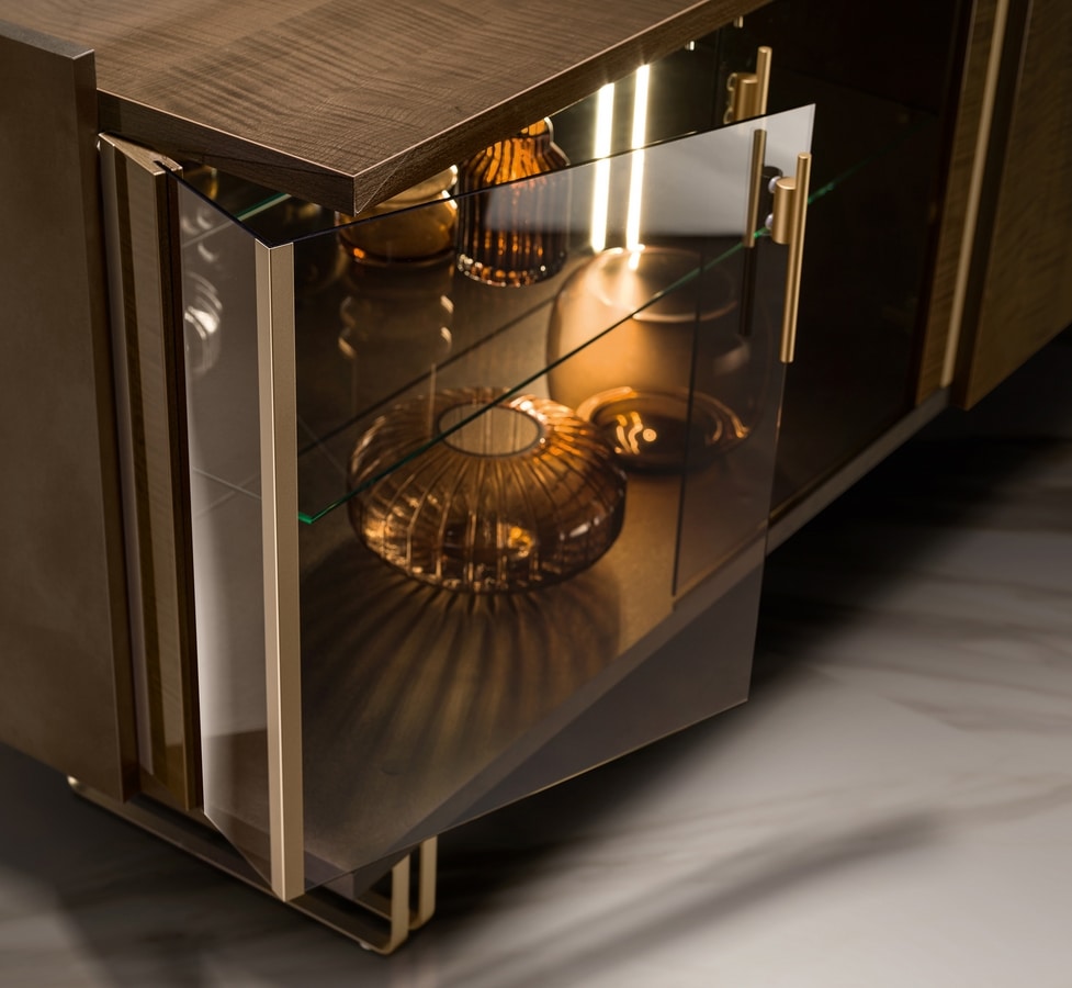 Richiedi prezzi Prodotti similiNelle madie, il particolare del piano d’appoggio “a vassoio” è un dettaglio che ne esalta la funzionalità e la cura progettuale. A dare ulteriore valore alla collezione, i vetri bronzati che caratterizzano madie e vetrine. Nella madia, il particolare in vetro ad angolo saldato alleggerisce il volume, rendendolo più arioso e luminoso. Un dettaglio di alto pregio, che amplifica la profondità visiva e sottolinea il carattere raffinato di Fiamma.