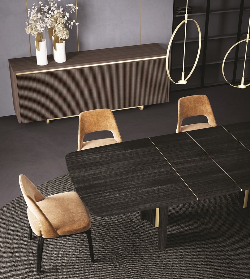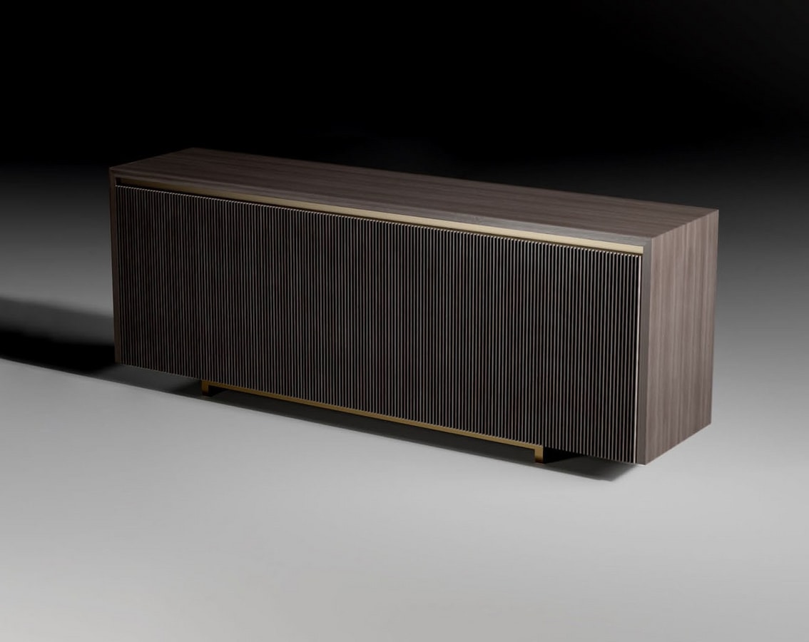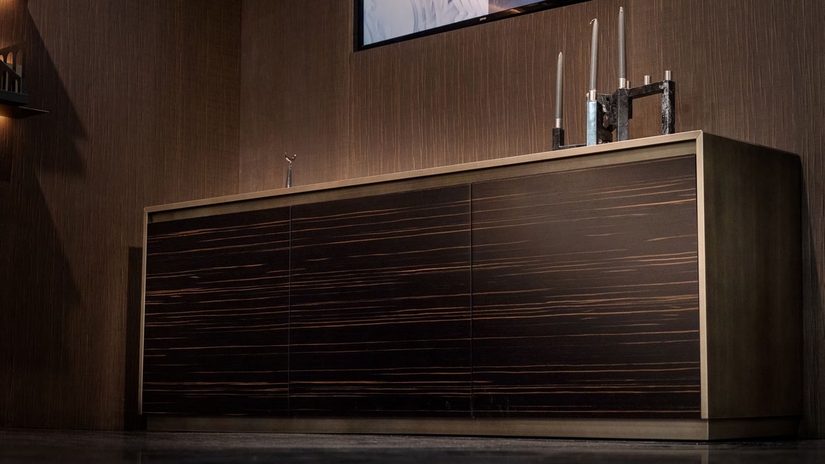 La credenza Focus, con le sue essenze calde, porterà calore e intimità nella stanza. Focus è disponibile in una vasta gamma di finiture in legno con dettagli in ottone.