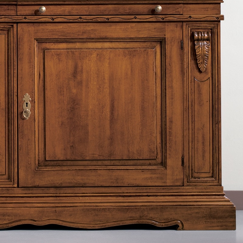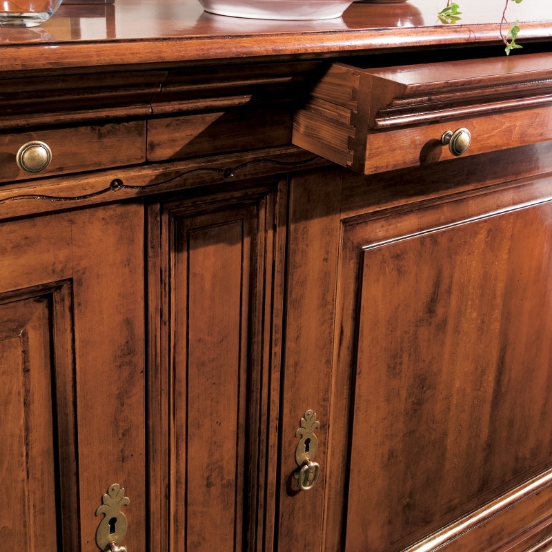 Richiedi prezzi Prodotti similiCredenza classica di importanti dimensioni, con il corpo diviso in due ante grandi bugnate. Sotto al piano sono inseriti due cassetti, sui lati del mobile sono presenti dei decori realizzati con la tecnica artigianale dell'intaglio, che consiste nella scultura del legno massello. L'intaglio posto sulla spalla della credenza decora in maniera raffinata l'immagine solida e tradizionale di questo mobile.