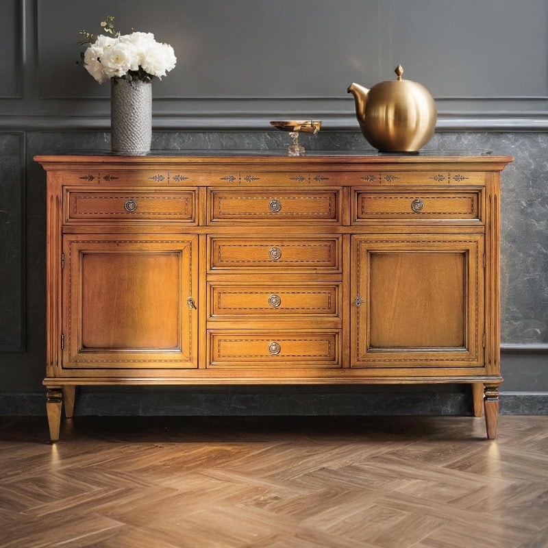 Richiedi prezzi Prodotti similiCredenza con due ante, quattro cassetti al centro e due cassetti più grandi ai lati. Piano sporgente dal perimetro del mobile con fascia sottostante incisa a motivi floreali. Ante e frontale dei cassetti arricchiti da filettature colorate. Montanti delle spalle con unghiate, piedi a spillo. Ante, frontali dei cassetti e fianchi riquadrati con cornici a più sagome. Questo credenza in stile classico permette di arredare con gusto e raffinatezza le case più eleganti. Questi mobili vengono spesso inseriti in arredamenti moderni per creare un piacevole contrasto di stili.