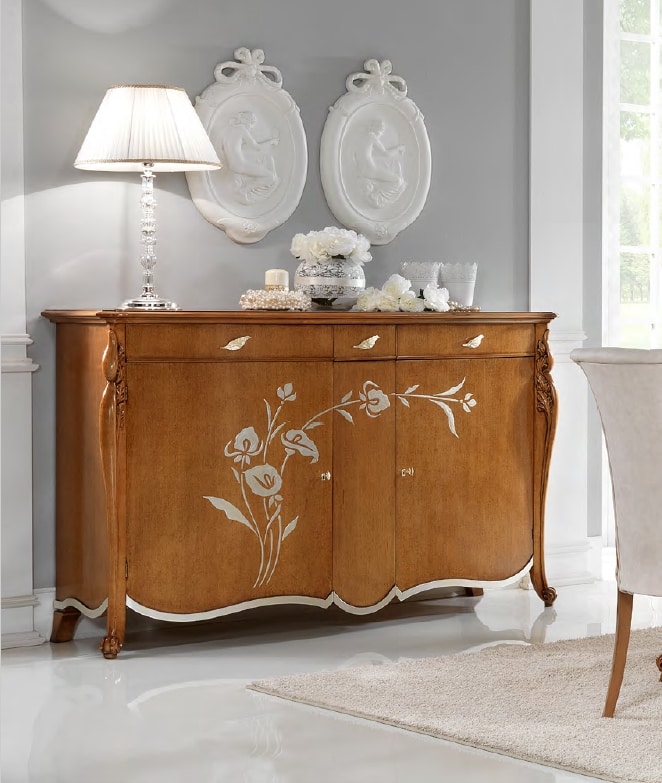Raffinata credenza in legno noce, con decori floreali
