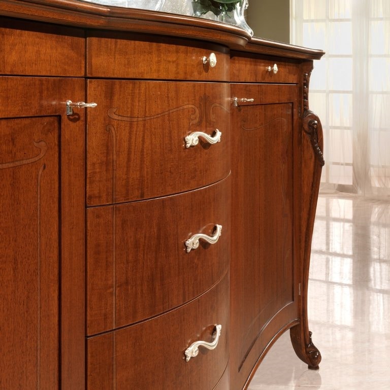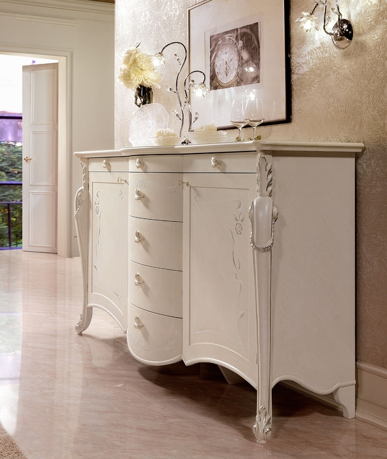 Credenza in stile classico, con struttura in legno laccato bianco, con decori artigianali. Dotata di 2 ante e 7 cassetti.
