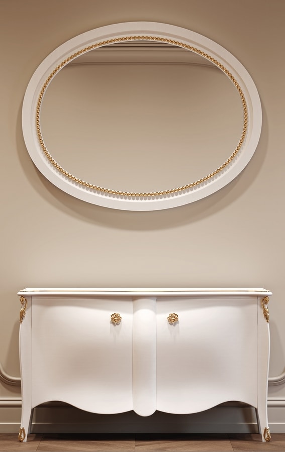 Credenza a 2 ante, in legno laccato, con decori finitura oro.