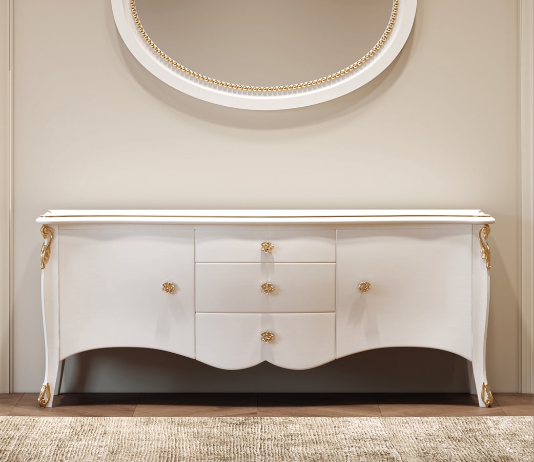 Credenza a 2 ante e 3 cassetti, in legno laccato, con decori finitura oro.