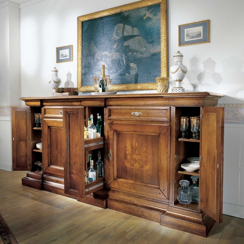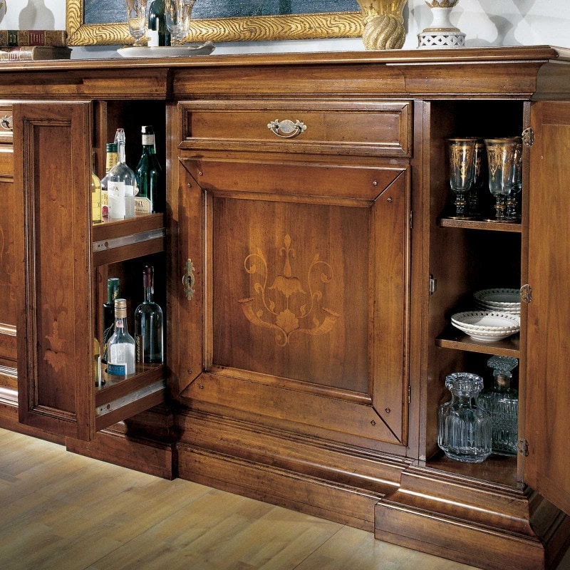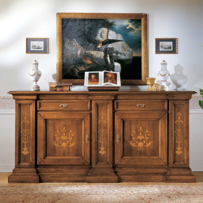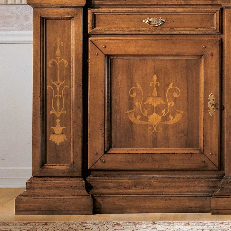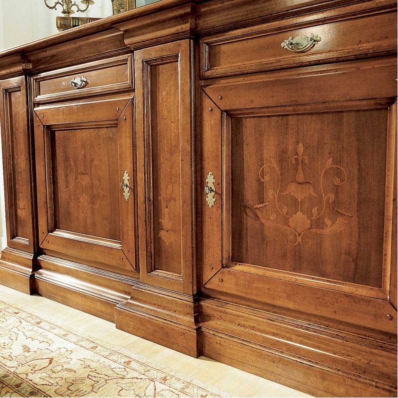 Questo credenzone può essere realizzato anche senza intarsi floreali ma con pannelli intarsiati con venatura disposta a spina di pesce, in tal caso il codice di riferimento è LACASA-E513. Su richiesta è possibile realizzare il credenzone senza alcun intarsio.