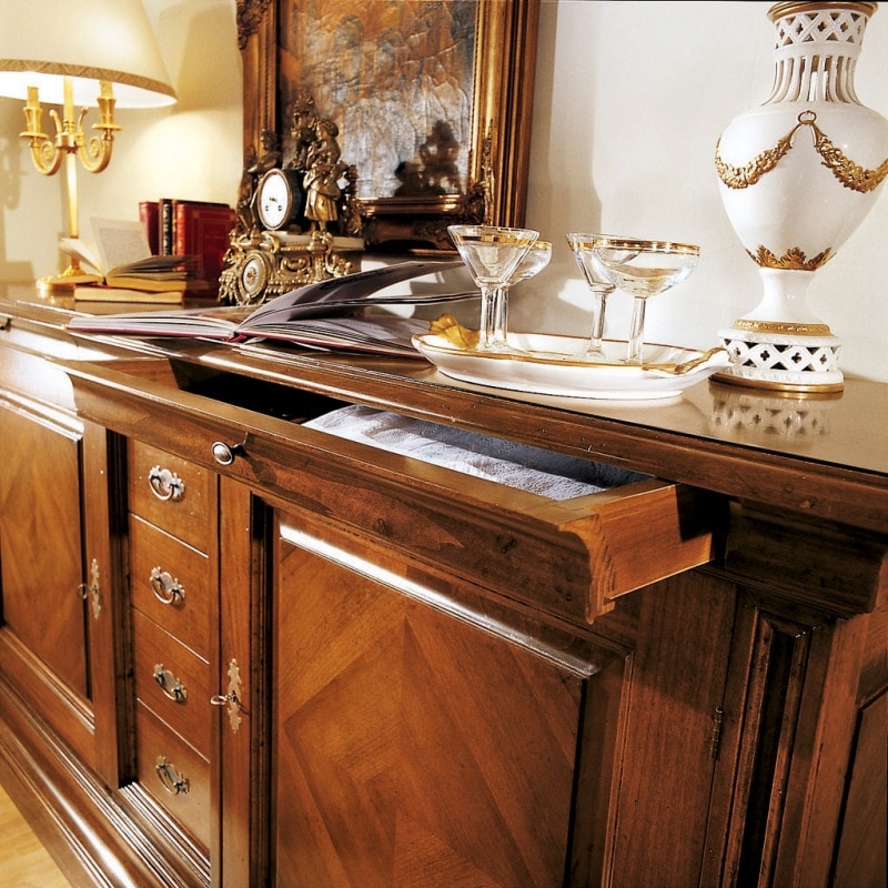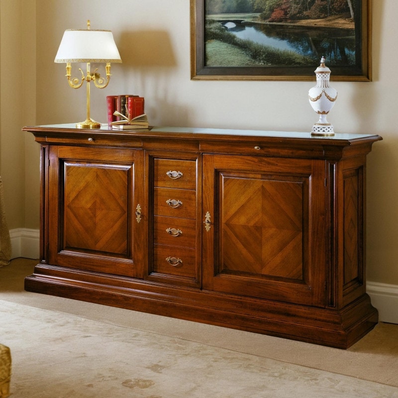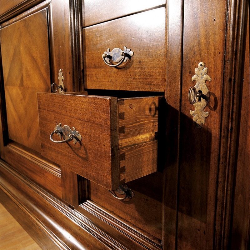 Richiedi prezzi Prodotti similiCredenza classica in legno con due ante e quattro cassetti al centro. Sotto al piano sono inseriti due cassetti parzialmente integrati nella cornice. Ante arricchite da un piacevole motivo a rombo, chiuse con serratura. Spalle laterali riquadrate da piccole cornici in rilievo.