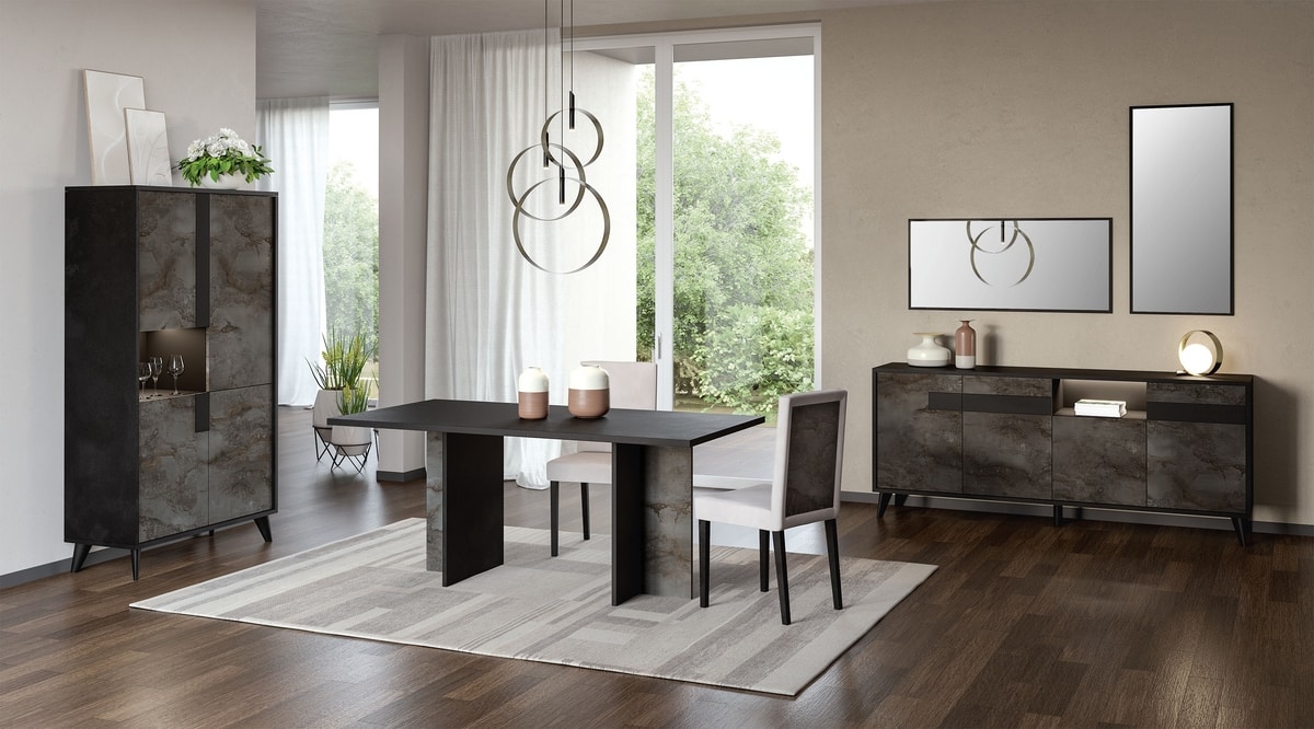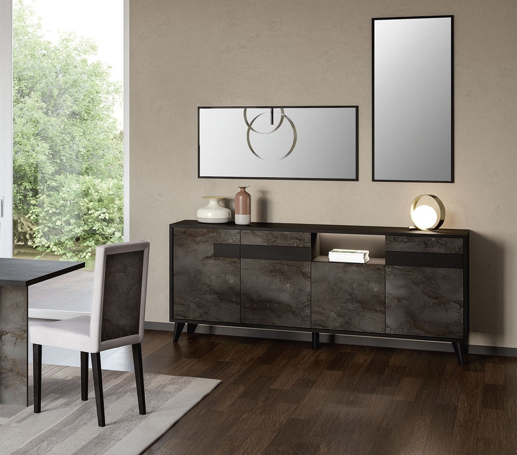 Credenza a quattro ante con struttura in legno finitura nero opaco, frontali in finitura ossido opaco. Dotata di illuminazione LED. Ideale per l'arredo di soggiorni dallo stile contemporaneo.