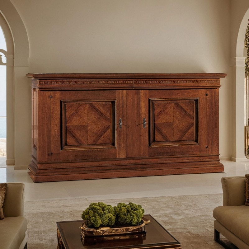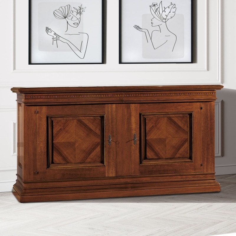 Richiedi prezzi Prodotti similiCredenzone intarsiato appartenente alla serie "Verona", con due grandi ante con ripiano interno e due cassetti sotto al piano. Fianchi riquadrati, zoccolatura di importanti dimensioni che segue l’andamento del basamento. Ante con pannello centrale intarsiato a rombo. Nel complesso si tratta di un mobile classico ed elegante, con forte presenza, perfetto per una casa tradizionale e raffinata.