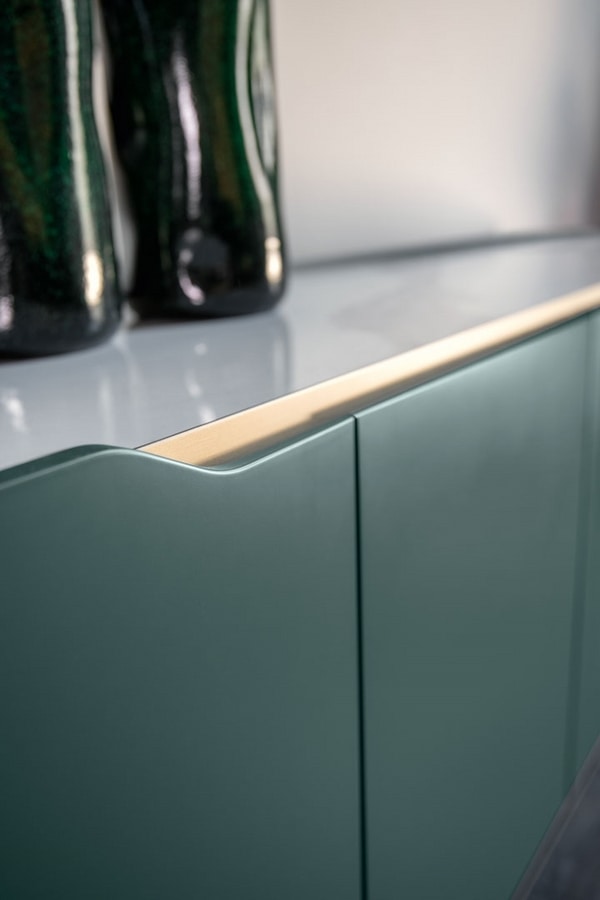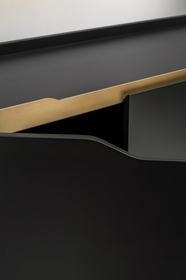 L’apertura ergonomica delle ante consente un’estrema essenzialità della forma. Le ante laterali sono sagomate facendo scoprire una lastra piatta in metallo incastonata nel legno. Il top può essere in legno oppure impreziosito da pietra e marmo. L’interno è diviso da un piano in vetro sagomato molato a filo lucido. I piedini e i supporti per il vetro sono registrabili. Oasi l’innovativa collezione dal caratteristico profilo metallico, a esse, che avvolge elegantemente la struttura del mobile.