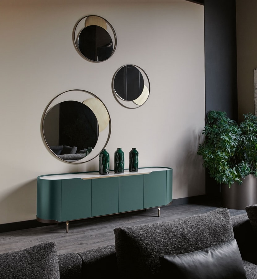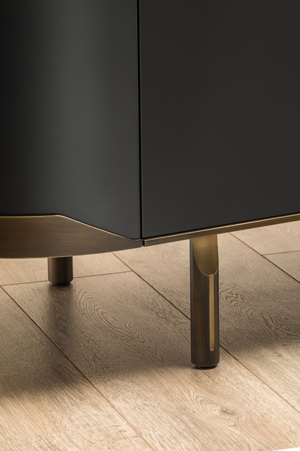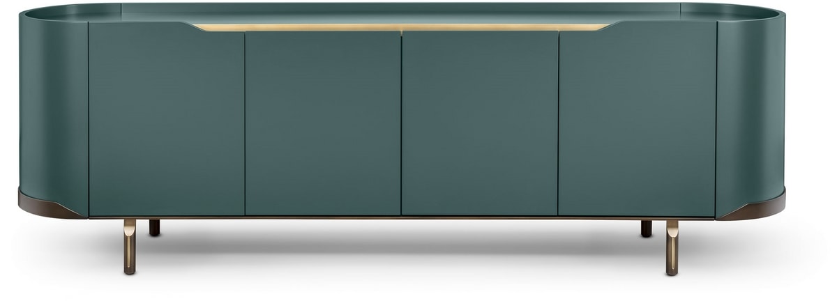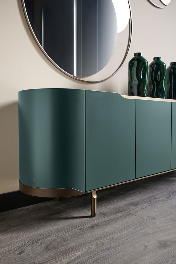 Oasi madia a tre o quattro ante ha fianchi in legno curvato e la base in acciaio a spessore curvato e tagliato a laser.