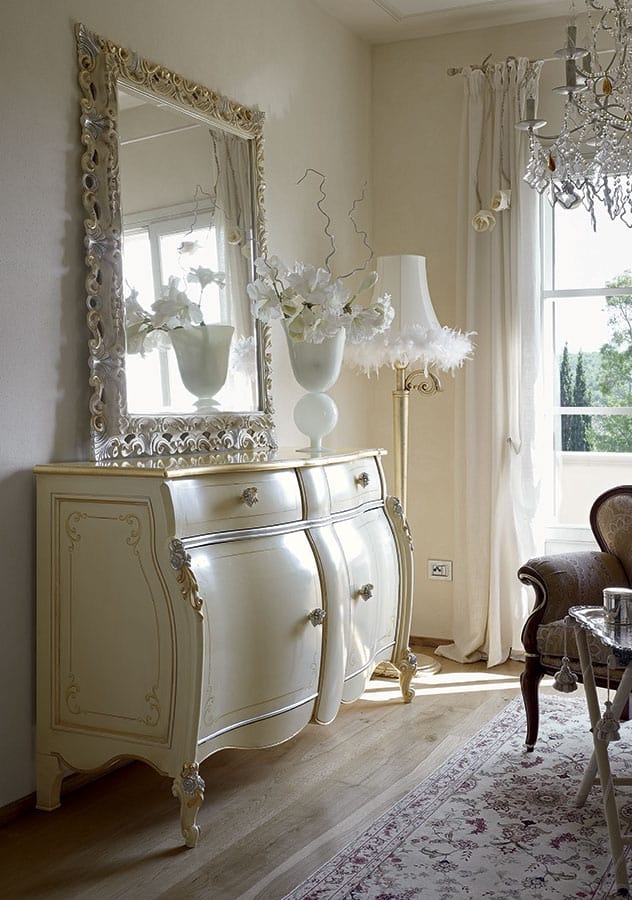 La credenza presenta delle luccicanti laccature avorio. Uno stile romantico per vocazione, animato dalle decorazioni e dal design fatto di pezzi unici, tutti in legno.