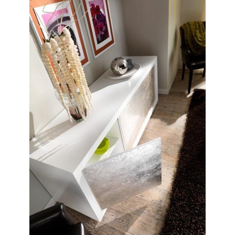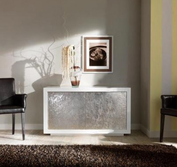 L'argento spatolato lucido è una lavorazione completamente artigianale che prevede la creazione di un fondo spatolato ad arte sul quale viene successivamente applicata la foglia argento, con finitura lucida. La superficie irregolare crea uno spettacolare gioco di riflessi di luce.