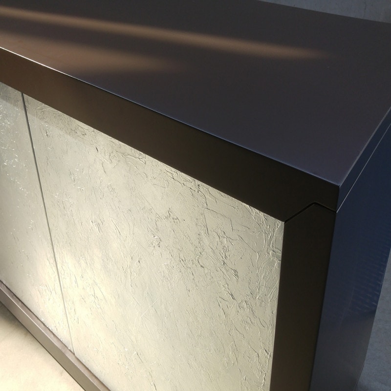 L’argento spatolato lucido è una lavorazione completamente artigianale che prevede la creazione di un fondo spatolato a mano sul quale viene successivamente applicata la foglia argento, con finitura lucida. La superficie irregolare crea uno spettacolare gioco di riflessi di luce.