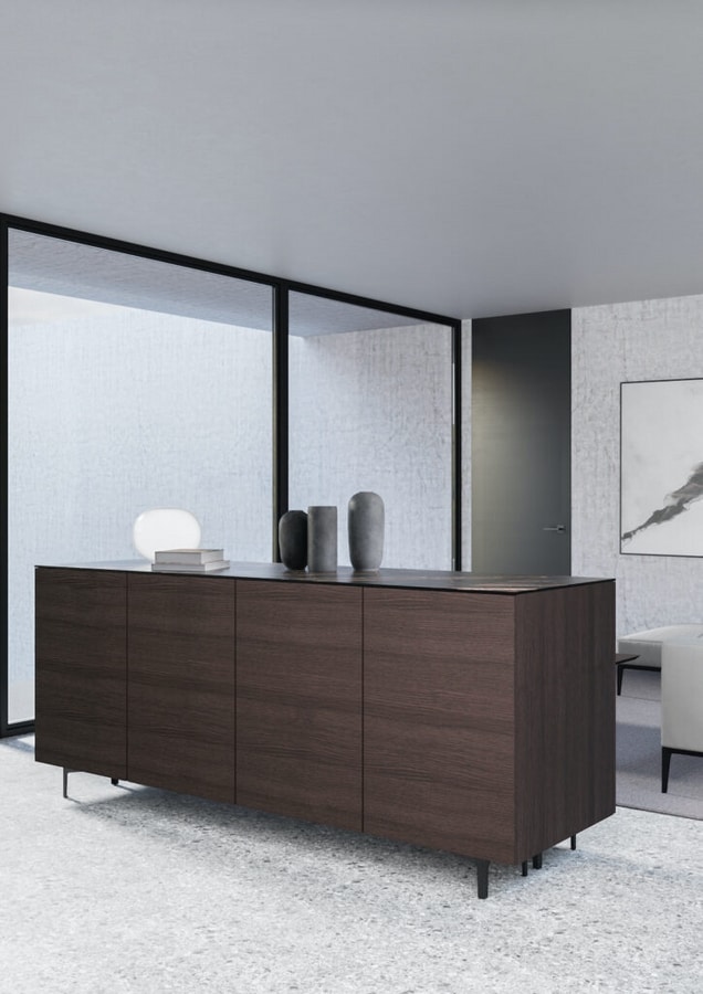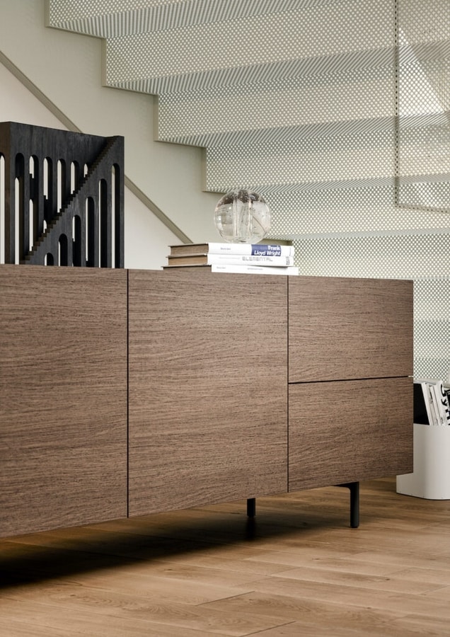 Richiedi prezzi Prodotti similiMadia componibile con piano in legno (rovere o noce), fenix, hpl o ceramica e piedini a scelta (da 5 a 17 cm) in legno o metallo. Ante con apertura push-pull e cassetti con sistema Blumotion ammortizzato. Possibilità di ante e cassetti in fenix o hpl.