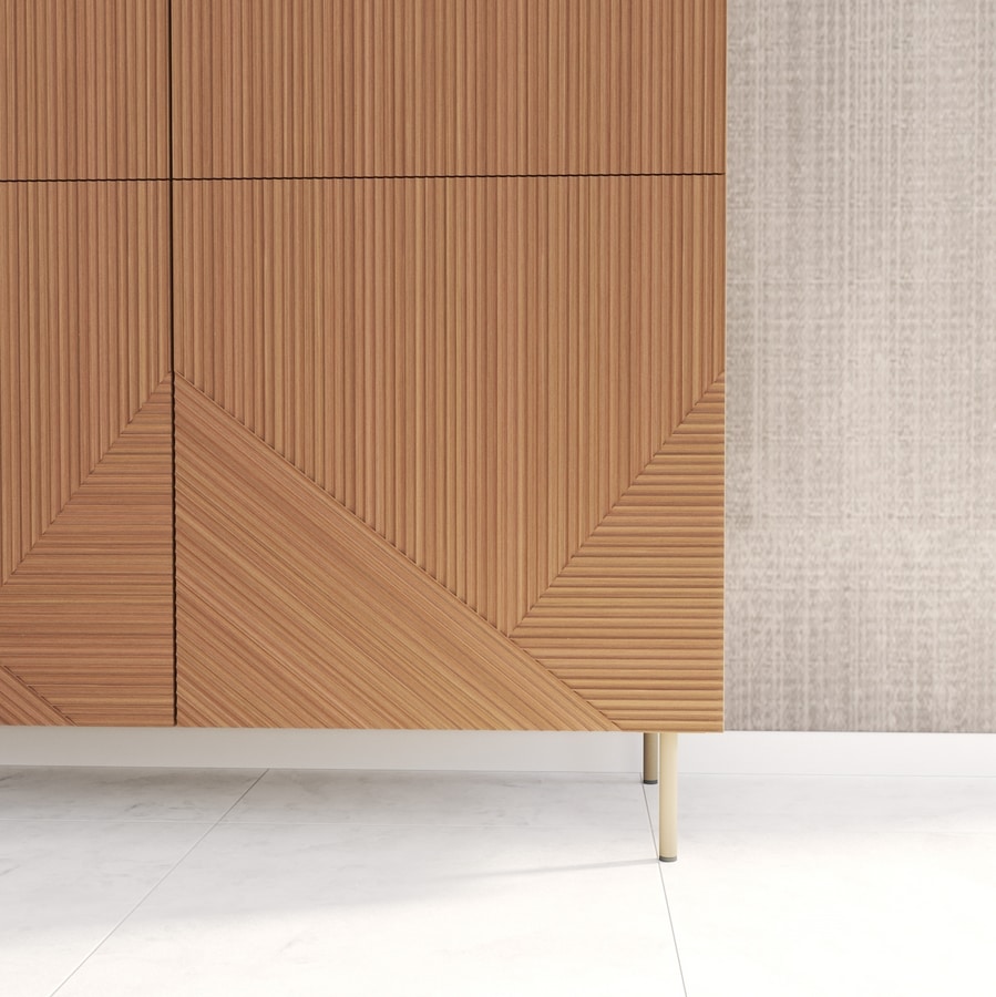 Le ante cannettate in 3D creano un ritmo verticale che cattura i riflessi e li trasforma in texture. Il disegno materico dialoga con il top specchiato e la base a slitta. Virgo è offerta in varianti cromatiche e dimensionali, con allestimenti interni coordinabili: un segno incisivo che arreda con armonia e proporzione.