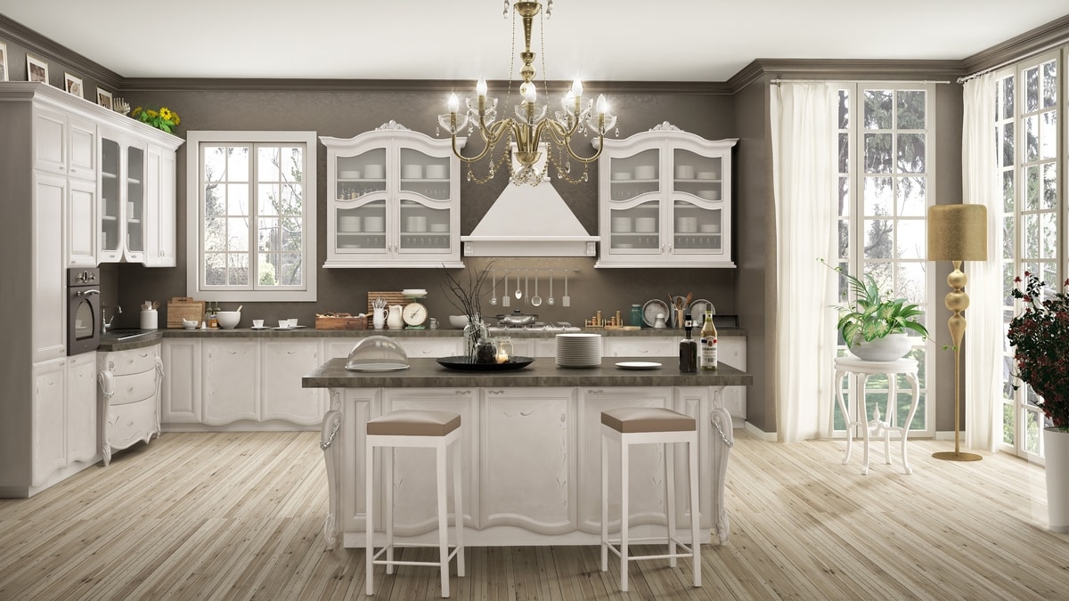Cucina in stile classico, in legno laccato bianco, con intagli e decorazioni realizzate artigianalmente. Ampia composizione angolare con isola centrale.