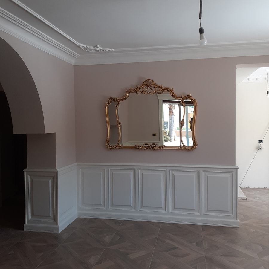 Boiserie realizzata su misura per l'arredo di una sala. Pannellature in in legno laccato bianco.