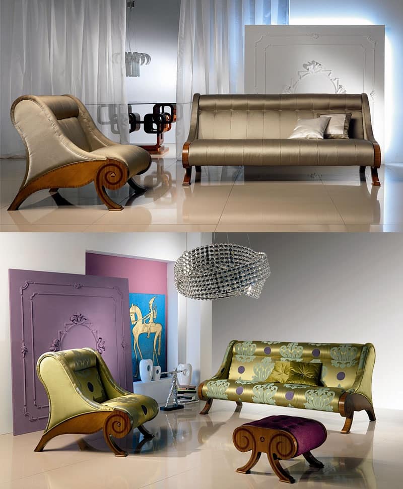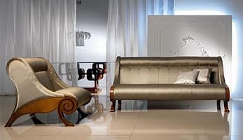Divano in stile per salotti. Sistema di sedute composta da divano e poltrona. Le forme a tutto tondo dell’imbottito sono riprese e sottolineate da intarsi in zebrano e mogano su fondo in noce che ne arricchiscono i fianchi e ne divengono il motivo ricorrente. Anche l’imbottitura è volutamente realizzata con linee curve e studiatamente ergonomiche. Ha struttura portante in multistrato. Il divano è disponibile anche nelle versioni DI05 2 posti (cm. 140x98x93h), DI07 4 posti (cm. 240x98x93h). Ampia è la scelta tra le possibilità di rivestimento. A richiesta, possibilità - come nella foto - di cucitura trapuntata.