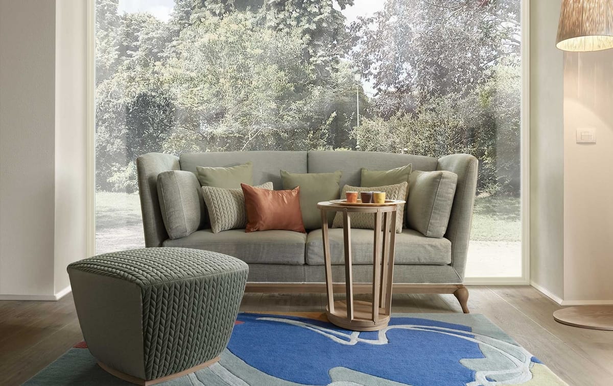 Divano a due posti con base in legno massiccio.