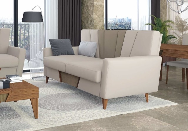 Divano dal design contemporaneo, con piedi in legno noce canaletto.