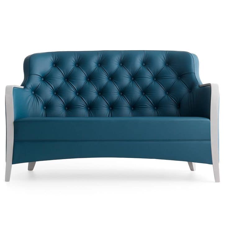 Divano con fusto in legno massiccio. Sedile e schienale tappezzato su fusto. Schienale anteriore con tappezzeria capitonné. Braccioli in legno verniciati. Senza dettaglio di bottoni sullo schienale esterno.
