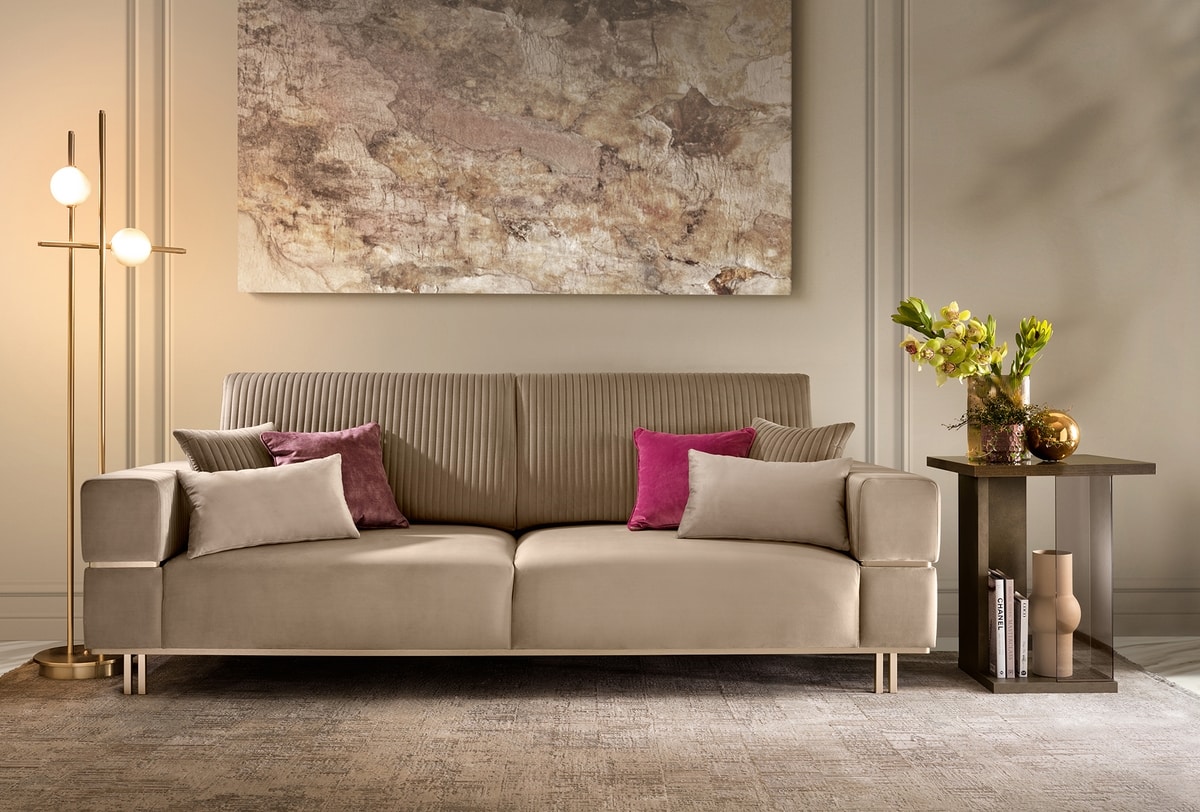 Richiedi prezzi Prodotti similiI divani della zona living Fiamma interpretano una comfort zone contemporanea, fatta di volumi morbidi e geometrici, studiati per coniugare relax ed estetica di alta gamma. I profili metallici dei braccioli e i piedini in oro satinato color champagne riprendono le finiture della zona giorno, creando un fil-rouge visivo tra gli ambienti che valorizza i progetti d’interni più esigenti. La possibilità di scegliere i rivestimenti nell’ampia cartella tessuti Adora consente configurazioni personalizzate, trasformando ogni divano in un elemento distintivo e su misura.