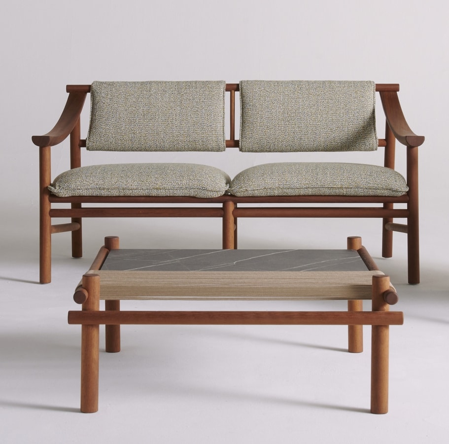 Divano 2 posti in legno di frassino, con rivestimento in tessuto