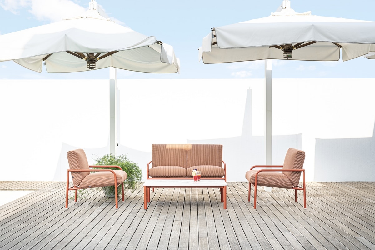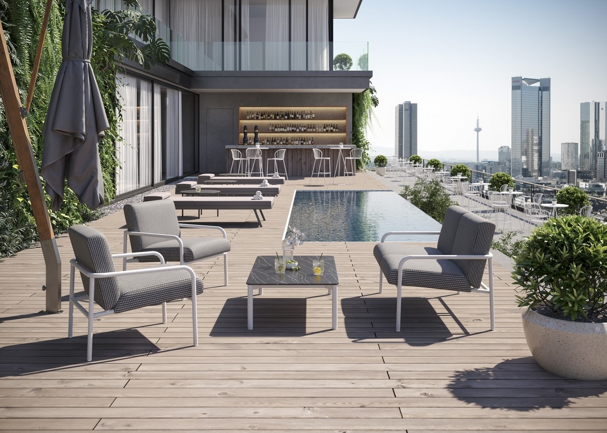 Pilar nasce dall’incontro perfetto di design moderno e comfort senza tempo. Ogni poltroncina lounge e sofà è una dichiarazione di stile, un invito a godere della vita all'aria aperta con un tocco di eleganza. La struttura in alluminio, solida e raffinata, poggia su quattro gambe che garantiscono stabilità e resistenza. I cuscini, morbidi al tatto ed accoglienti, sono il cuore del comfort di Pilar, progettati per essere rimossi, sfoderati e puliti con facilità, assicurando sempre un’esperienza unica di relax. Il tessuto melange è ideale per gli esterni: resiste alla luce intensa del sole e alla corrosione di salsedine e cloro, garantendo una bellezza che dura nel tempo.