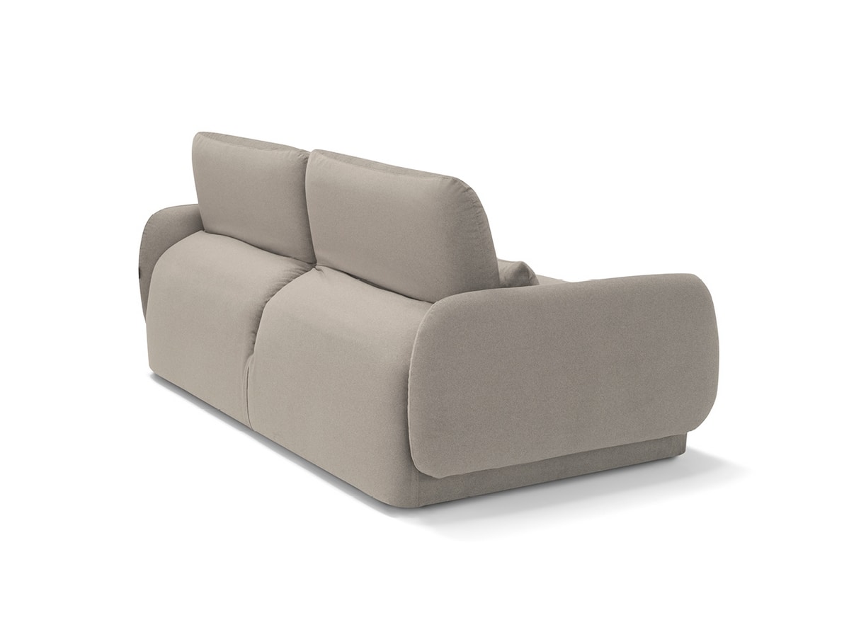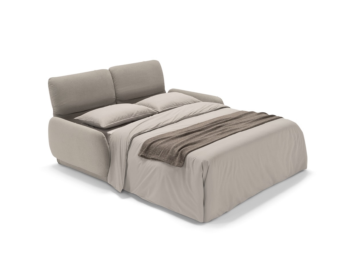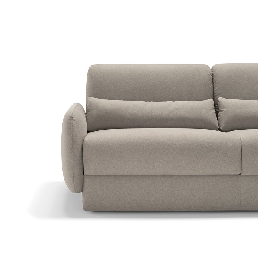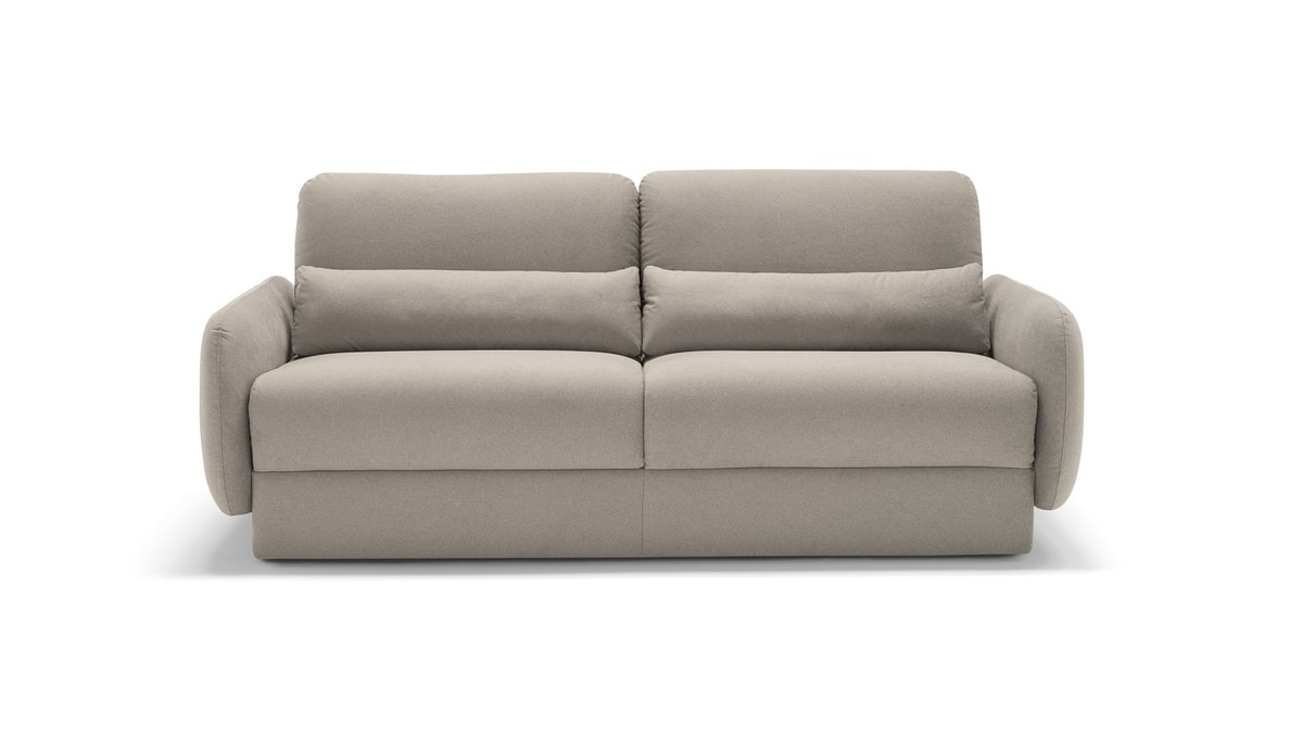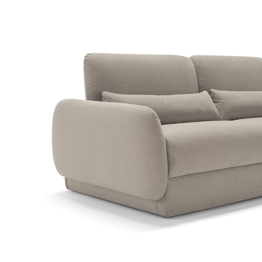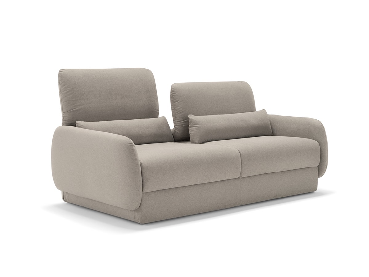 Divano letto dalle forme arrotondate. Dotato di poggiatesta reclinabile.