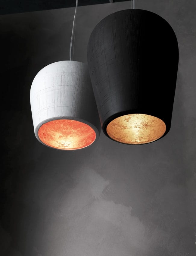 Lampada sospesa in ceramica incisa a mano nei colori Bianco, Nero, Tortora, Cacao o Sabbia. Interno Bianco, Foglia oro o Foglia rame.