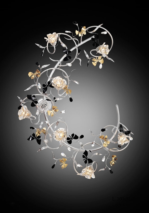 Plafoniera 7 luci G9 max 40 watt/ finitura argento foglia, nero tempera e oro foglia antico/cristalli Scholer trasparenti/ diffusori luci Murano trasparenti+oro.