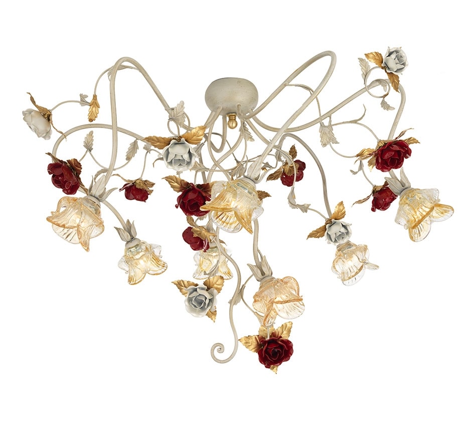 Plafoniera 7 luci G9 max 40 watt/ finitura avorio scuro sfumato oro, rose tempera rosso + bianco lucido particolari in oro foglia antico/diffusori luce Murano trasparenti+ambra. Dimensioni struttura diametro cm 46 altezza cm 60.