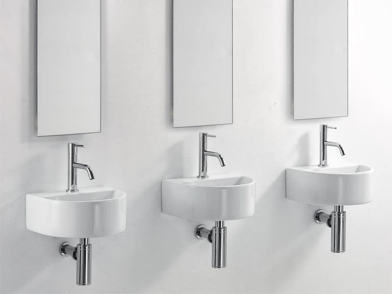 Un lavamani dalla forma essenziale, semicircolare. Ideale per ambienti pubblici dove lo spazio è ridotto.
