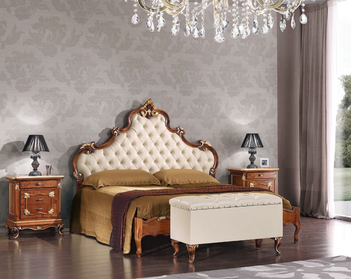 Letto classico in stile Art Deco. Testiera in pelle con imbottitura capitonné, cornice intagliata. Rete da 180cm.